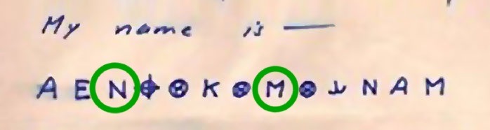 We are now at the 11th symbol. From this point on, we will combine the solutions of the previously deciphered symbols. The symbol ‘N’, which previously represented ‘M’, now has the meaning ‘M’ again.