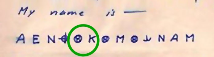 That’s not all. The tenth symbol has an additional encryption: it is not yet in the correct position. Symbol 6 is a ‘K’, symbol 8 is an ‘M’, and between them is a symbol with a circle-8. There is only one letter in the alphabet between K and M, namely ‘L’. This indicates that the ‘L’ must be moved between K and M in order to interpret the code correctly.